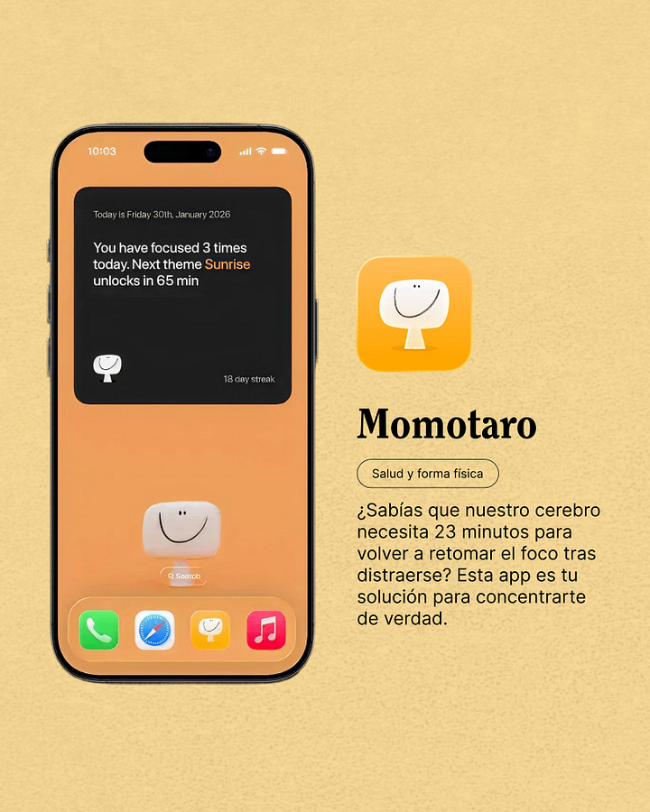Es mi nueva app preferida para concentrarme sin distracciones, y Made in Spain. Visualmente preciosa (está diseñada por Laszlito Kovacs, así que es normal) y puedes seleccionar en tramos de 10 minutos o activar una de las sesiones predeterminadas por color. Además, incorpora ruido rosa y es perfecta para esos momentos de concentración o desconexión.