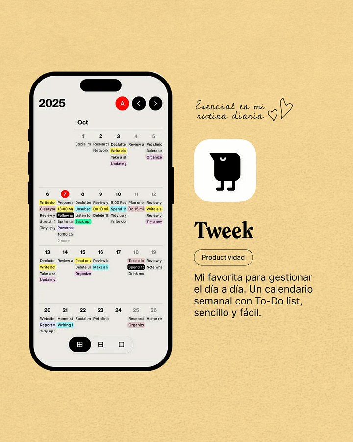 Es mi favorita para gestionar el día a día. Un calendario semanal a modo de app, con una To-Do list diaria que puedes ir tachando para no olvidarte de nada. Tienes colores personalizados, tareas recurrentes, puedes conectar tu calendario de Google. Llevo años usando la versión pro y es esencial en mi rutina diaria para saber en qué estoy trabajando.
