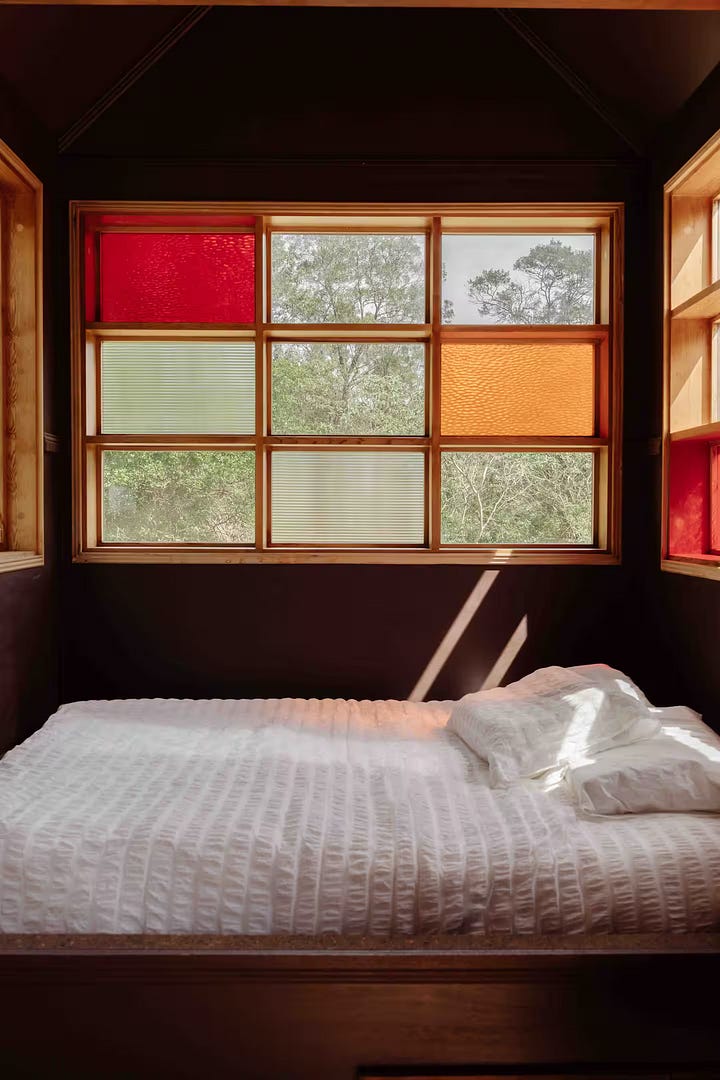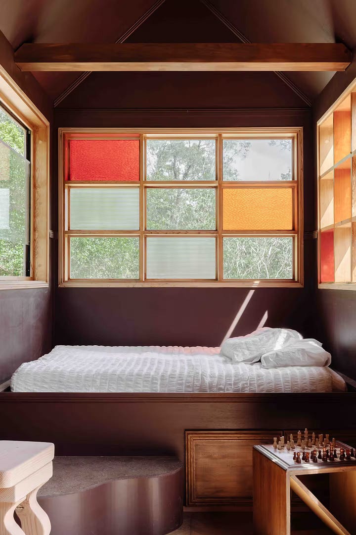 The Ritual Lodge es una pequeña cabaña concebida como refugio aislado en un claro junto al arroyo Tapitallee, en Nueva Gales del Sur (Australia). Desde fuera, parece una construcción encontrada más que un proyecto reciente: la madera envejecida, los troncos dispuestos como cierre natural y los pequeños detalles artesanales hacen pensar en una estructura que lleva tiempo formando parte del paisaje.