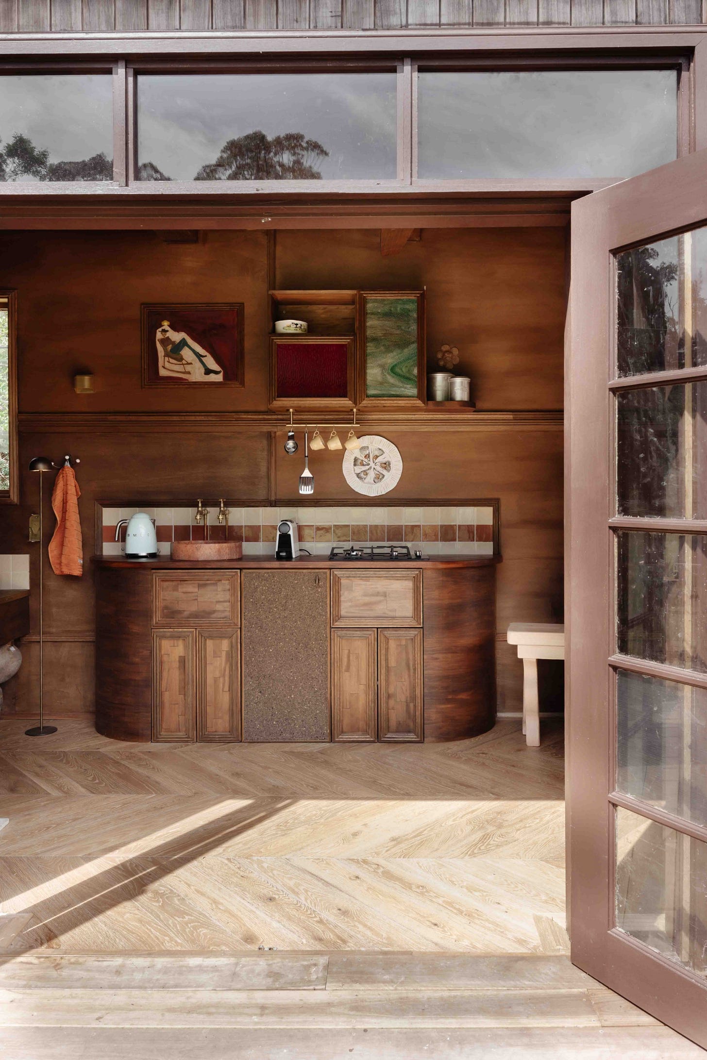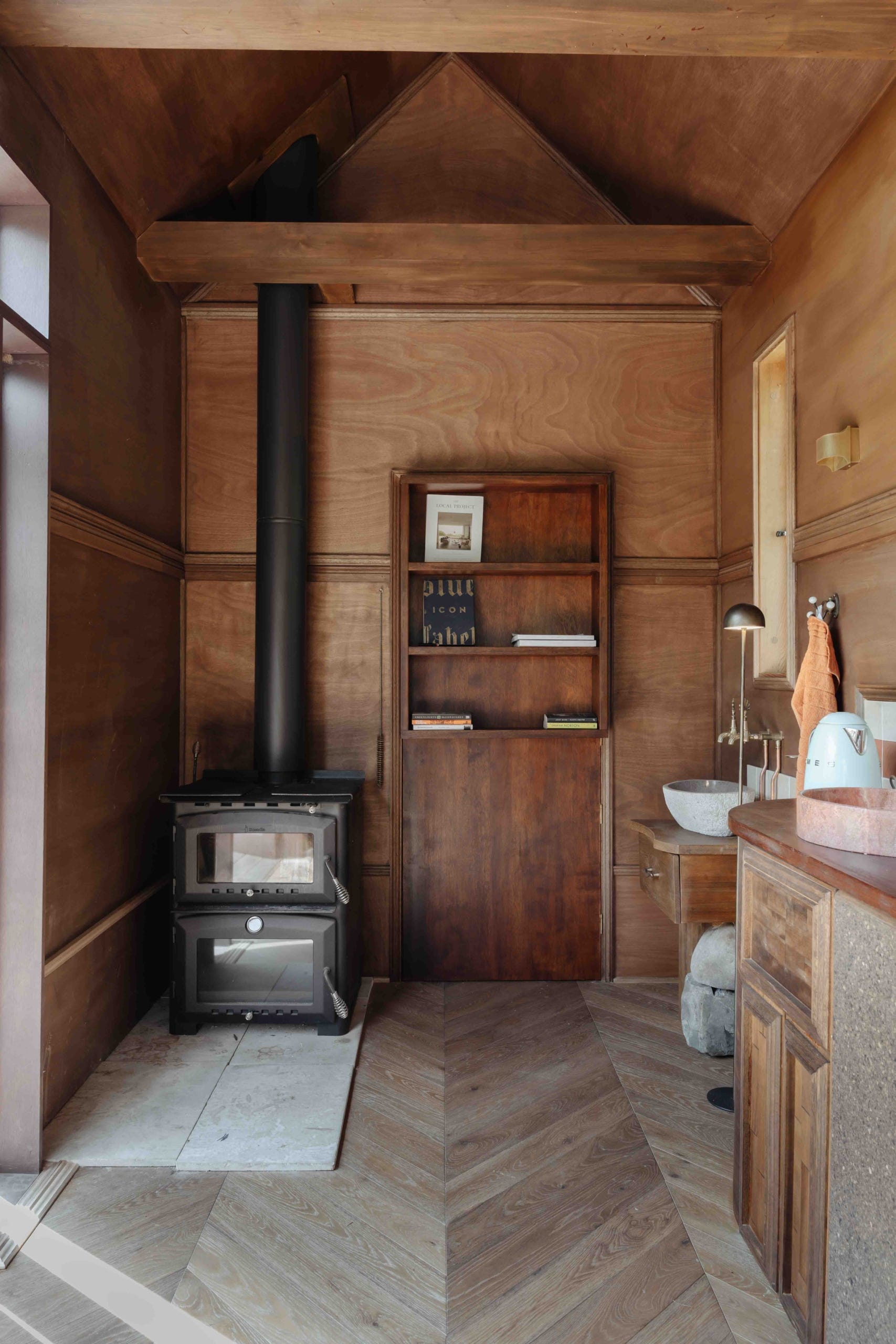 El interior continúa esa misma lógica. La mezcla de maderas refuerza la sensación de espacio hecho a mano, mientras que pequeños acentos metálicos y el alicatado de la cocina aportan contraste y definición dentro de una planta abierta y compacta. Todo está pensado para ser funcional, cómodo y fácil de habitar.