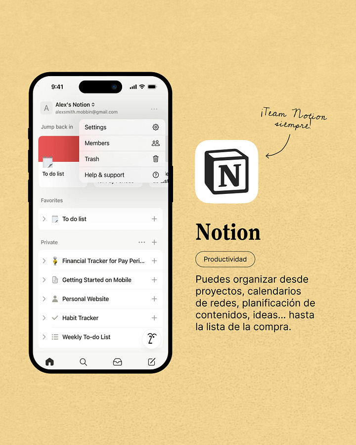 He entrado tarde en Notion y ha sido la mejor decisión que he tomado en mucho tiempo. Aquí tengo organizadas desde mis clases, tareas, proyectos, calendarios de redes, planificación para la newsletter, ideas… Es totalmente personalizable y tienes en un mismo lugar todo lo que necesitas.